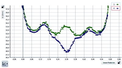 Widerstand in Abhängigkeit des Ortes. Grün: mit Stein, Tasse und Becher Blau: mit Stein, Alublock und Becher |
