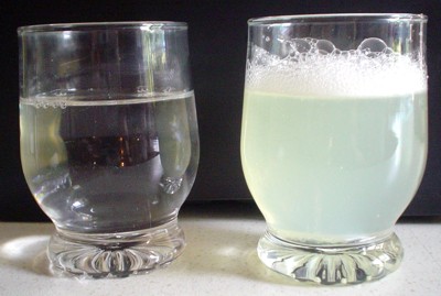 Umgerührtes Glas Wasser ohne und mit Eiweiß |