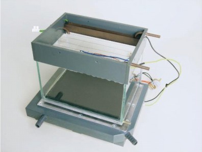 Die Kammer mit Verdampfungsquelle und Hochspannungsgitter |