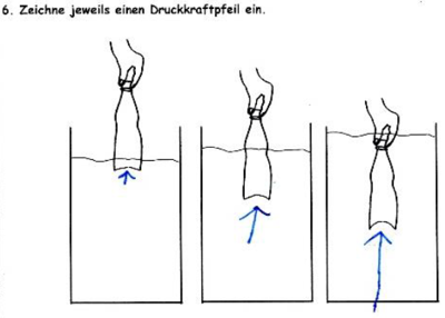 | Testaufgabe zur Tiefenabhängigkeit des Wasserdruckes mit Schülerlösung in blau | Testaufgabe zur Kraft auf einen Körper im Wasser von oben und von unten mit Schülerlösung in rot | |||