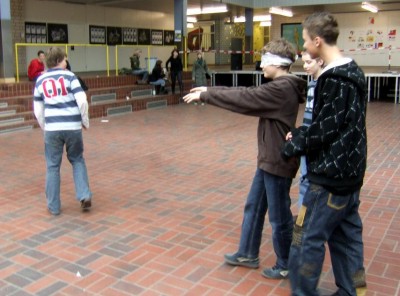 Abbildung: Grunderfahrungen zur Beschreibung von Bewegungen im Spiel: Damit der blinde Fänger den voraus laufenden Schüler fangen kann, braucht er Informationen über die nötige Bewegungsrichtung |