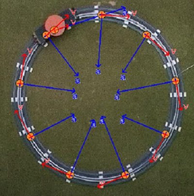 Abbildung: Das Videoprojekt am Computer zeigt eine Kreisbewegung der Lego-Eisenbahn mit simultaner Darstellung von Geschwindigkeit und Beschleunigung |