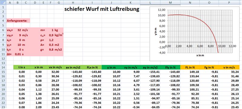 Schiefer Wurf mit Luftreibung bei Excel |