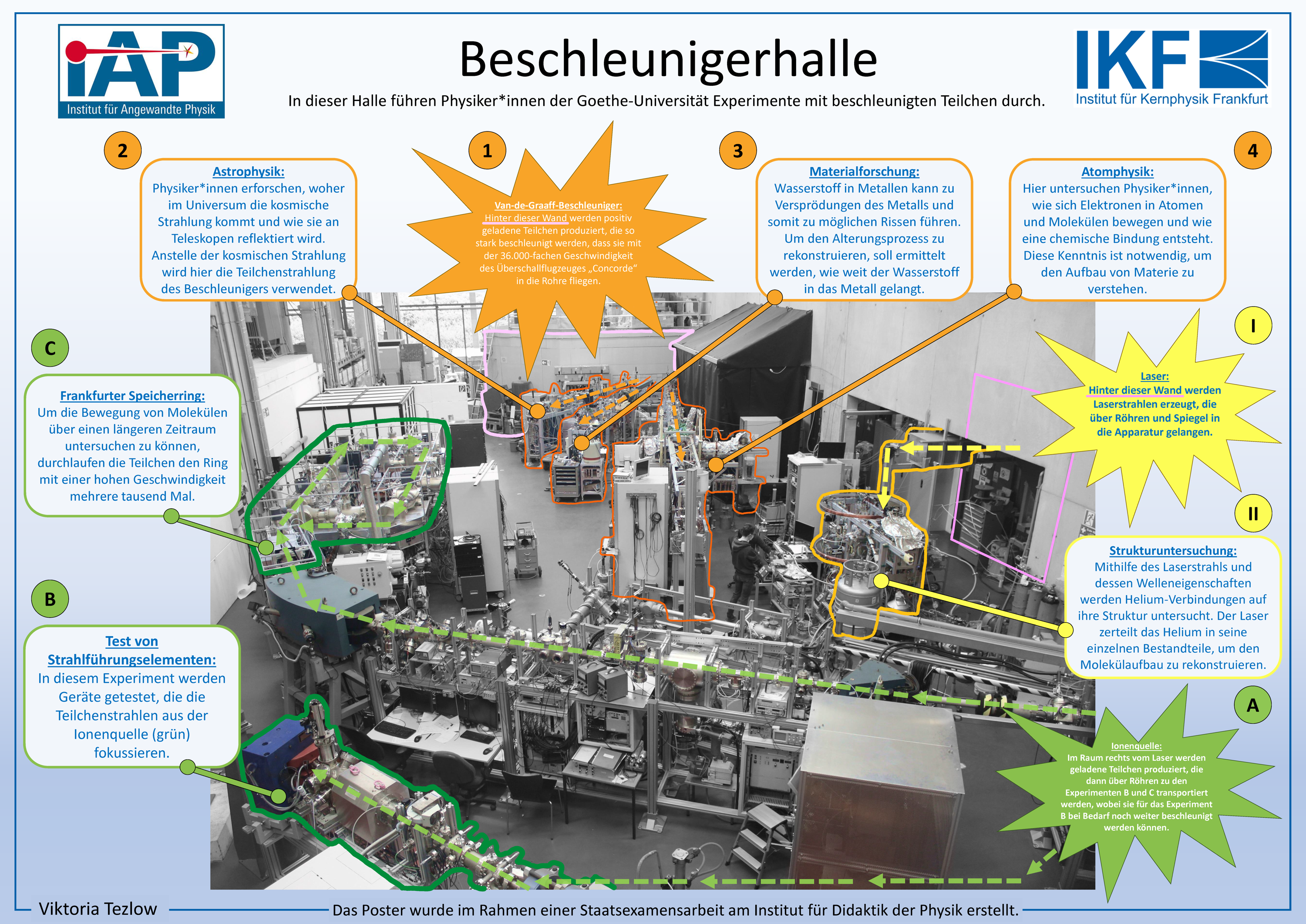 Vom „Café Physik“ aus kann man in die Experimentierhalle der Physik der Goethe-Universität schauen. Das tun jedes Jahr viele Menschen, u.a. etwa 4.500 Schüler und Schülerinnen, die ein Schülerlabor der Physik besuchen. Dabei bleibt jedoch unklar, was dort geforscht wird und was in den „Rohren“ geschieht. Dies vereinfacht darzustellen, ist eine typisch physikdidaktische Aufgabe. Auch die empirische Überprüfung einer solchen Darstellung, z.B. mit einem Leitfadeninterview mit Schüler*innen ist eine typisch physikdidaktische Aufgabe. Frau Tezlow hat in ihrer wissenschaftlichen Hausarbeit „Konzeption von Info-Postern zur Frankfurter Beschleunigerhalle“ zwei Poster in DIN A0 erstellt, die im „Café Physik“ aufgehängt werden. Nach der Einleitung wird im 2. Kapitel eine Übersicht über die rechte Hallenseite gegeben und im 3. Kapitel die physikalischen Grundlagen davon dargelegt. Im 4. Kapitel werden die physikalischen Grundlagen der linken Hallenseite dargelegt. Im 5. Kapitel wird die Konzeption des Posters zur rechten Hallenseite vorgestellt und im 6. Kapitel die Konzeption des Posters zur linken Hallenseite. Im 7. Kapitel geht es um die Interviews zum Poster der rechten Hallenseite. Im 8. Kapitel werden die sinnvollen Änderungen beschrieben, die aufgrund der Interviews gemacht wurden. Analog werden im 9. Kapitel die Interviews zum Poster der linken Hallenseite und im 10. Kapitel die sinnvollen Änderungen beschrieben, die aufgrund der Interviews gemacht wurden. Im 11. Kapitel wird ein Fazit gezogen. | ||||